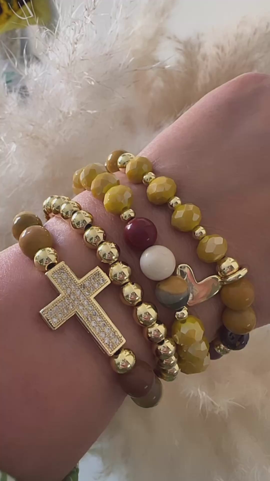 Transform your style with our versatile set of four bracelets made of gold-plated beads, charms, and mustard and multicolored agate. Create a unique look by wearing them together or mix and match for any occasion. Elevate your accessories game with this stunning set.
