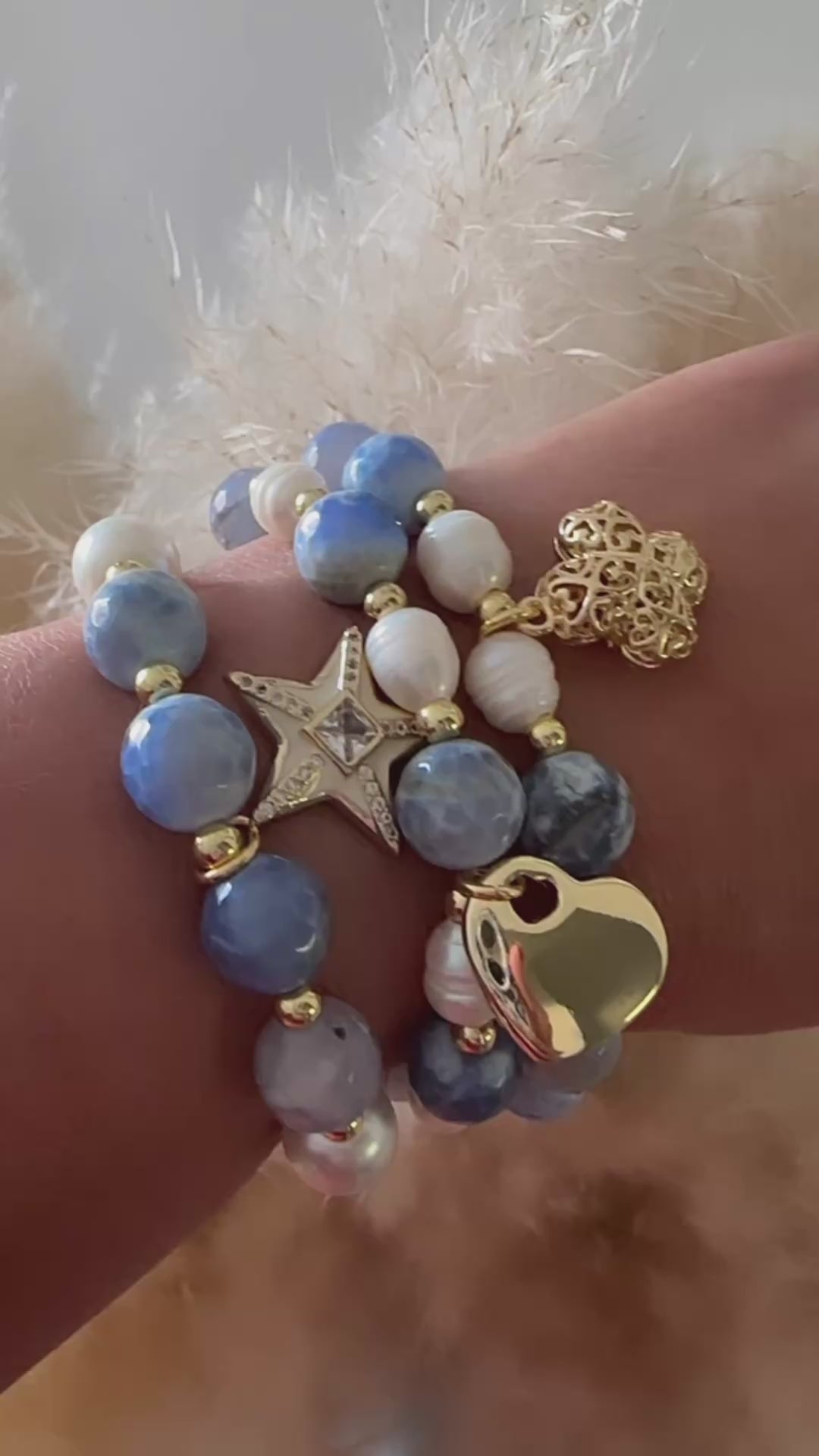 Enhance your style with the stunning Blue Agate and Freshwater Pearl Stack. This piece features three strands of freshwater pearls and blue agate stones, accented with a cross, star, and heart charm. The gold plated finish adds a touch of elegance. Elevate any outfit with this beautiful, versatile accessory.