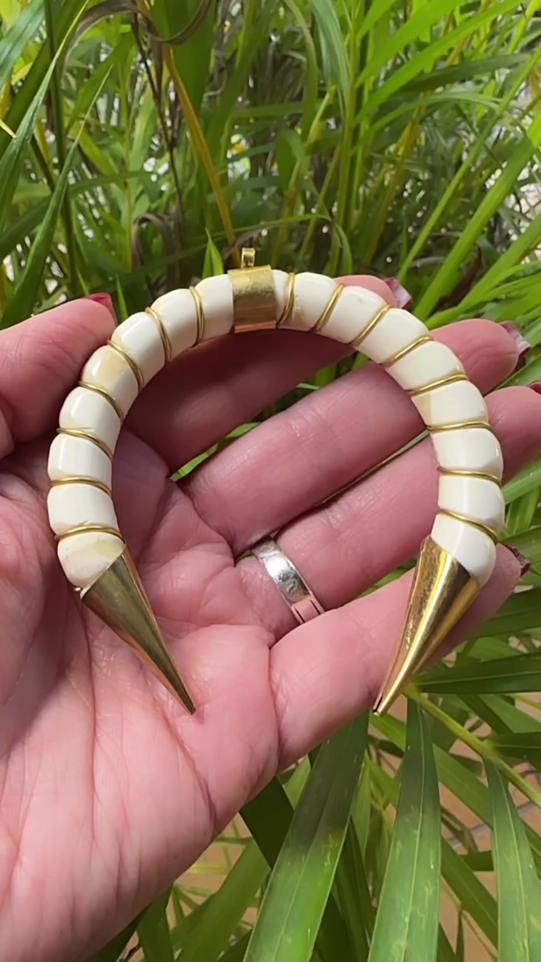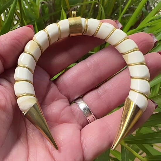 This wire wrapped carved torsade crescent horn pendant features a unique design made from 3.3 inches by 2.9 inches white buffalo bone. Crafted with expert wire wrapping techniques, it offers a sleek and elegant look to any outfit. Perfect for those looking for a statement accessory that exudes professionalism and expertise.