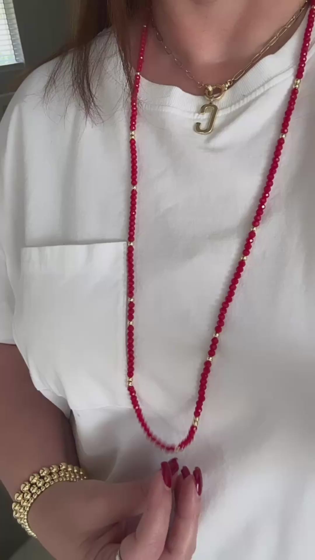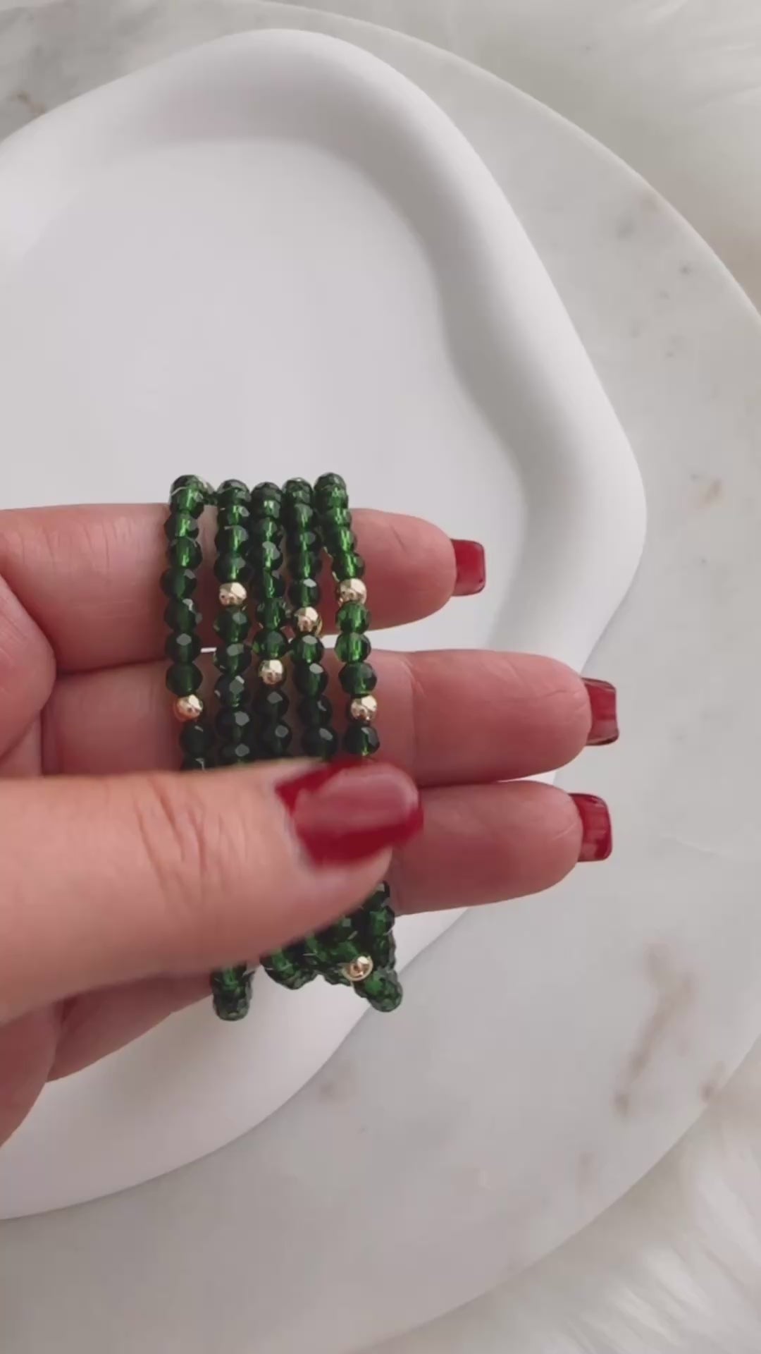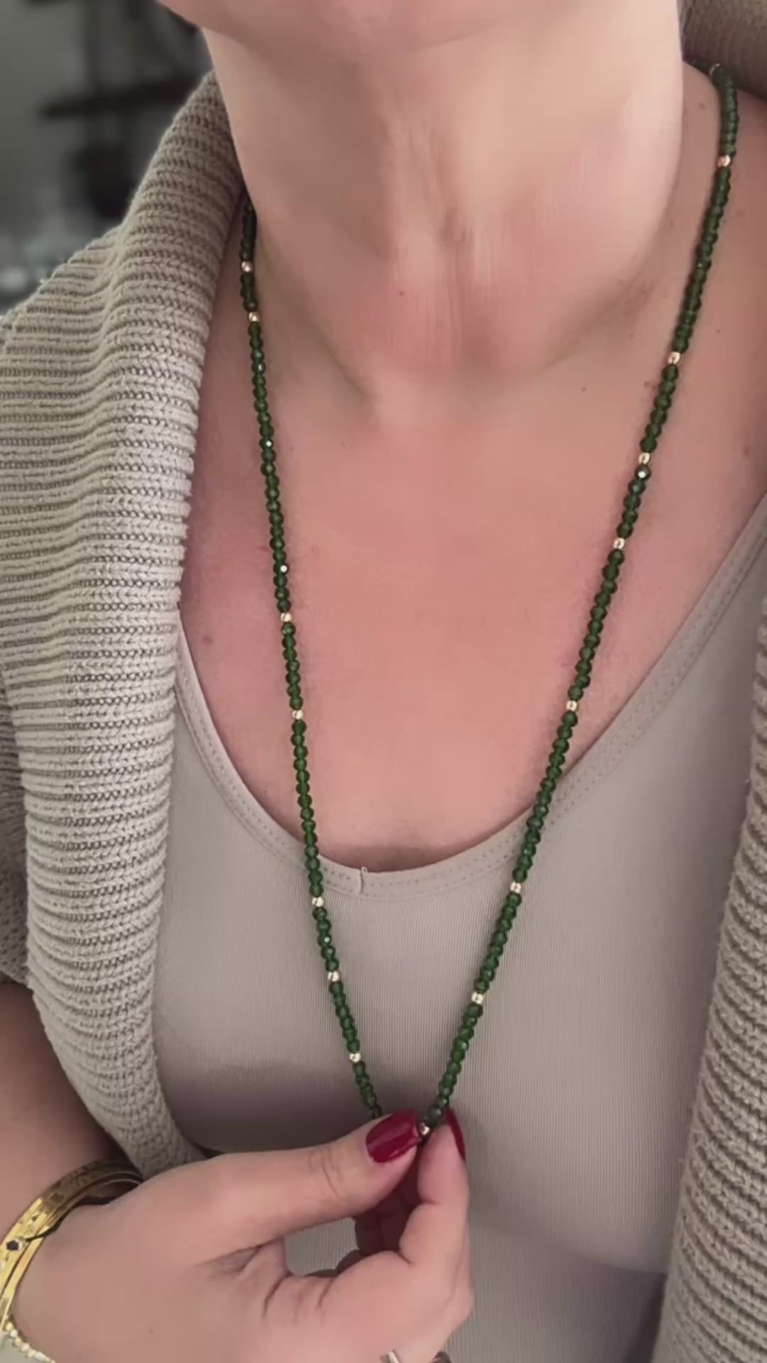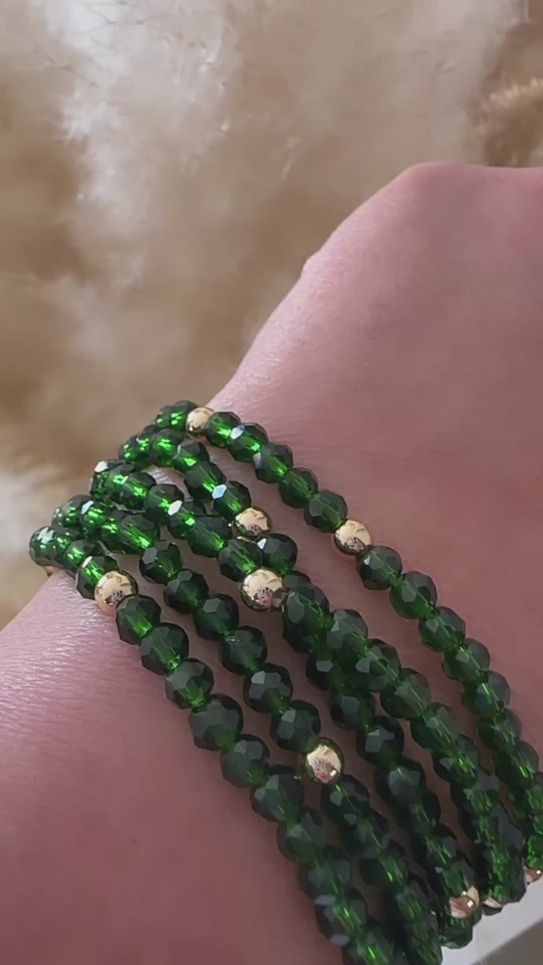 This versatile Emerald Green Necklace/Bracelet is expertly crafted with 34 inches of faceted emerald green crystals and gold plated beads. It can be effortlessly converted into a stylish bracelet, with the ability to wrap around your wrist 4 to 5 times. Perfect for the holiday season or adding a touch of elegance to any outfit.