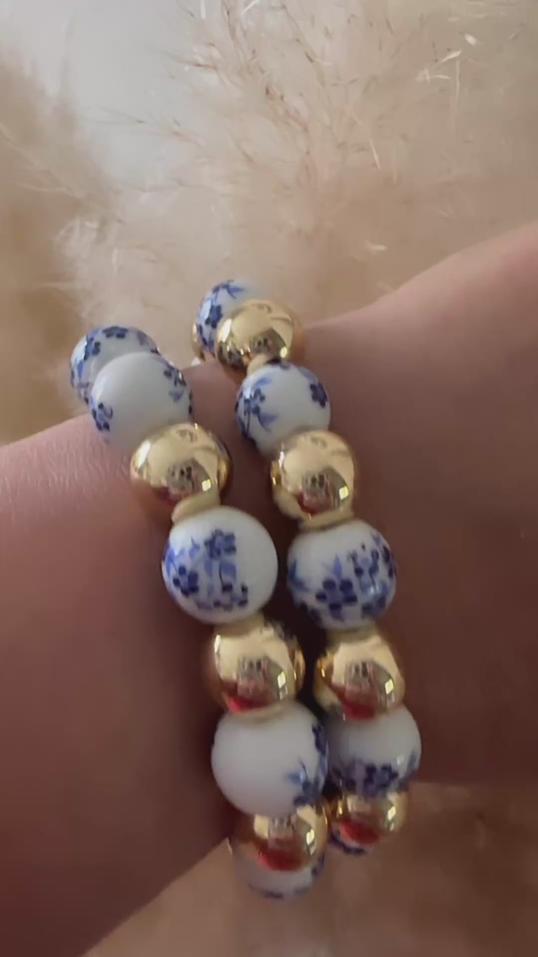 Elevate your style with our Large White and Blue Porcelain Stack. Made with bold, romantic era-inspired white and blue porcelain beads and shiny gold plated beads, these two bracelets will add a touch of elegance to any outfit. Complete the look with our Bridgerton or blue and white porcelain necklace.