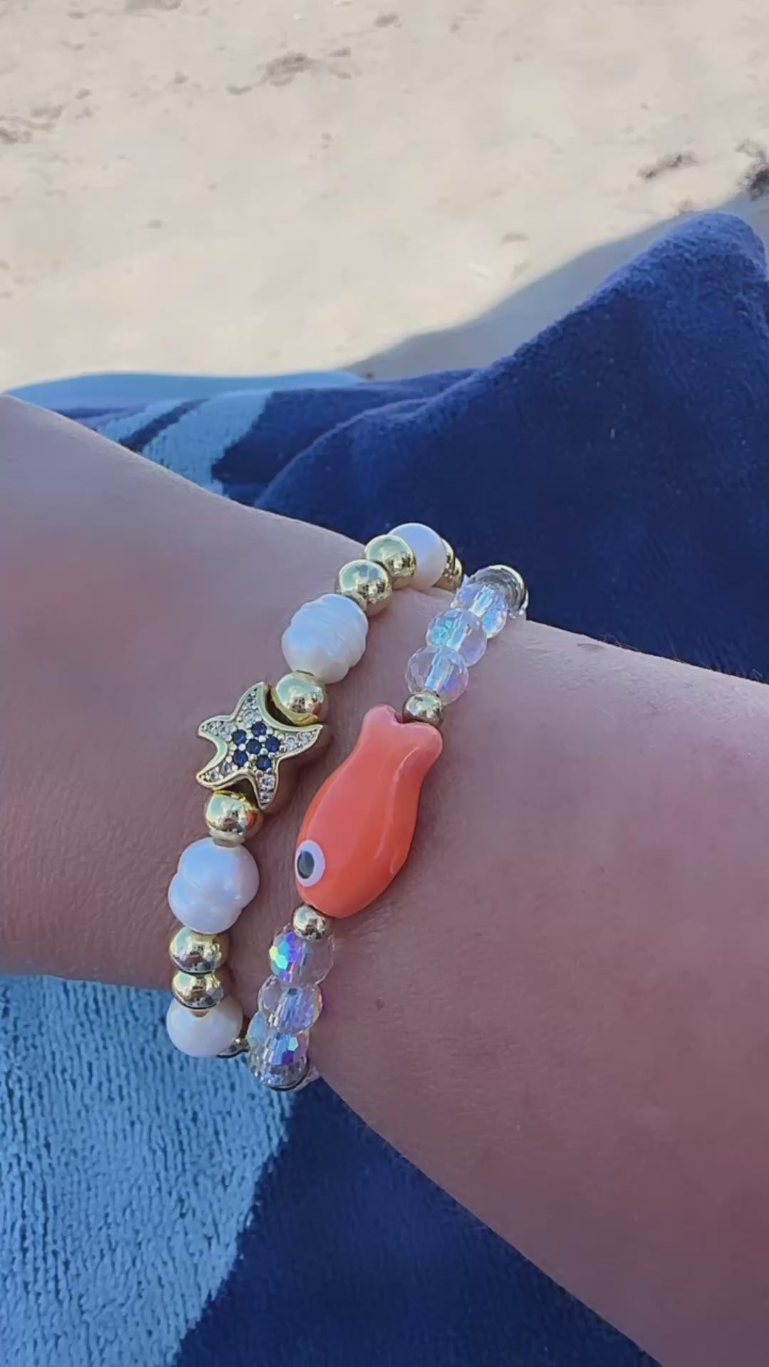 Enhance your ocean-inspired look with our Star of the Sea Bracelet. Made from gold plated beads and fresh water pearls, this bracelet features a stunning starfish charm encrusted with white and blue crystals. Perfect to stack with our Fishionista Bracelet or wear alone. Get 10% off when you buy both!