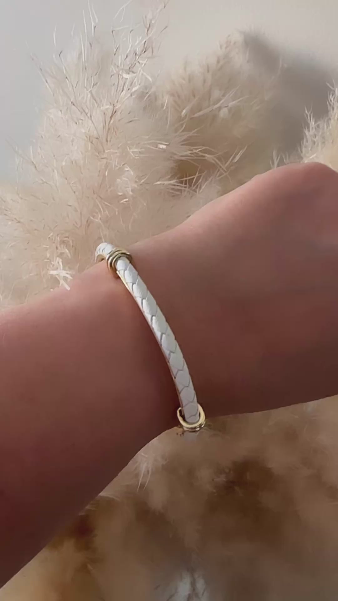 "Add a touch of elegance to your wrist with our White Braided Leather Bangle. Crafted with gold plated accents and rhodium, this bangle complements any outfit and pairs perfectly with other bangles in our collection. Elevate your style with this must-have accessory!"